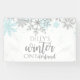 Bannière de premier anniversaire Winter Onederland avec des flocons de neige en parties scintillant bleue et argent.