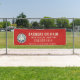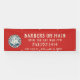 Un design horizontal avec un badge en barbier rouge blanc et bleu rétro style sur arrière - plan rouge. Personnaliser avec le nom et les détails du barbershop.