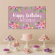Banderoles d'anniversaire mignonnes et girly rose et violet aquarelle florale et verdoyante pour filles et femmes de tout âge. Texte dans une police de script mignonne et fantaisiste dit "Joyeux anniversaire." Personnalisez avec le nom de l'invité d'honneur. Contactez-moi pour obtenir de l'aide sur la personnalisation ou pour demander des produits Zazzle supplémentaires personnalisables pour votre groupe.