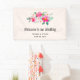 Bannière de bienvenue mariage avec une image d'aquarelle fantaisiste. Un bel agencement fleuri aux couleurs rose vif et rose pastel niché parmi des feuilles et des sprigs verts.