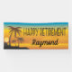 Bannière de la fête de la retraite avec une scène de plage en or et bleu avec des palmiers sur une île et des polices élégantes. Modifiez le nom à votre invité d'honneur. Amusez-vous pour votre collègue amoureux de la plage ou toute fête de retraite.