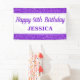 Cette joyeuse bannière d'anniversaire présente une parties scintillant faux violet. Personnalisez-le avec un nom.