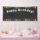 Banderole d'anniversaire joyeuse pour toile de fond photo ou fête d'anniversaire virtuelle. Des colonnes triangulaires aux couleurs vives, en haut et en bas, ainsi que des confettis et des étoiles éparpillés autour du texte sur un arrière - plan noir, font une déclaration festive.