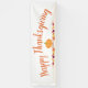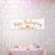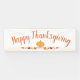 Une bannière de Thanksgiving qui dit "Bon thanksgiving" en gros caractères oranges et a une illustration d'un dessin animé, souriant, amical, citrouille. Le citrouille est entouré de feuilles d'automne colorées au sol. Le principal code couleur de la bannière est le blanc et l'orange.
