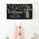 Bannière de mariage d'accueil chic campagnarde avec arrière - plan noir, lampes à cordes, bocal de mason aux fleurs de lavande violette, enveloppé de burlap avec initiales de couple et modèle mariage facilement personnalisable.