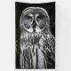 The Great Grey Owl - Portrait d'un grand hibou gris debout sur un log photographié en regardant directement la caméra.