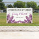 Un jardin de printemps Lilac Banderole Mariage, conçue avec des fleurs lilas délicates, sur un arrière - plan blanc. Le texte comprend : Félicitations, les prénoms de l'épouse et de la fille et la date du Mariage. Pour personnaliser, insérez simplement votre texte dans notre modèle, en remplaçant l'exemple. N'oubliez pas de consulter la collection complète de mariage du jardin de printemps Lilac pour les cartes et accessoires de réception correspondants.