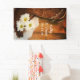La charmante bannière de Mariage campagnard White Daisies et Cowboy Boots peut être attachée à la voiture mariage des jeunes mariés ou utilisée comme signe pour accueillir et diriger vos invités à votre cérémonie de mariage ou réception à thème du ranch décontracté mais classe. Ce panneau de bannière rustique et informel, élégant et personnalisé, présente une numériquement photo florale rehaussée d'une paire de bottes de cowboy de l'Ouest brun, un bouquet de fleurs de marguerite blanche et un voile de mariée blanc avec un arrière - plan de grange brun patiné.