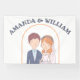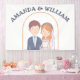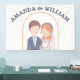 Cette bannière mariage présente une charmante illustration d'une mariée et d'un marié. Le marié est représenté avec des cheveux bruns courts, un teint clair, et porte une veste de costume bleu marine sur une chemise bleu clair et une cravate blanche. Il a une petite boutonnière épinglée sur son revers. La mariée se tient à côté de lui, souriant doucement. Elle a des cheveux ondulés, rougeâtre-oranges, ornés d'une couronne de fleurs rose, orange et blanche. Un délicat voile blanc coule derrière elle. Elle porte une robe mariage blanche avec un collier d'amoureux et un collier de perles. Cette illustration simple, en forme de dessin animé, suggère un lien amoureux des cordes entre eux. C'est fantaisiste et attachant, donnant un ton joyeux au prochain mariage.