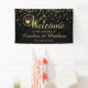 Bannière l'épousant personnalisée unique et élégante pour votre réception. Accueil au mariage de (les noms des jeunes mariés). Ajoutez le #tag, la date ou le nom de famille. Modèle Editable fait sur commande. Couleurs : l'or et le noir avec la topographie W conçoivent avec l'arrière - plan de confettis de coeur et d'or.