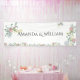 Cette superbe bannière mariage est ornée d'un élégant motif floral représentant des roses délicats et des hydrangées nichés au milieu de feuilles verdoyants. Les noms des époux sont imprimés à l'aide d'une police serif classique, ce qui améliore encore la sophistication générale. Personnalisez-le pour rendre votre journée de mariage vraiment exceptionnelle !