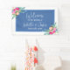 Bannière mariage personnalisée pour la réception avec de jolis accents floraux roses et centre bleu avec police blanche. Elégant thème mariage floral.