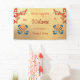 Ce panneau de réception de mariage tibétain présente un noeud de bonheur jaune traditionnel avec des rubans bleus, des fleurs rouges et des papillons et un texte de bienvenue mariage dans un script élégant sur un arrière - plan doré.