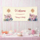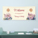 Ce panneau d'accueil de mariage tibétain présente un noeud et des fleurs de lotus sans fin et un texte d'accueil mariage dans un élégant script sur un arrière - plan crème moderne.