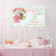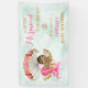 Sirène de bébé dormant dans une coquille de palourde dorée entourée de perles. Nageoire à queue rose et tiare dorée et rose. Sur la banderole on peut lire "Precious". Arrière - plan de menthe.