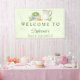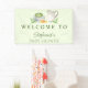 Bannière d'Affiche de bienvenue de Baby shower de thé vert moderne Matcha - Elevez votre décor de baby shower avec cette bannière de bienvenue. Une adorable bannière de bienvenue sur le thème du matcha avec un thé matcha à l'aquarelle avec accent du coeur et une pince à lait avec des feuilles de thé sur les côtés. Parfait pour les mamans d'être qui aime matcha, thé vert ou toutes choses santé et bien-être. Customisez ce modèle de bannière de bienvenue modifiable baby shower avec vos propres détails d'événement.