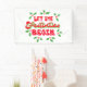 Cette bannière de Noël présente un design festif LET THE FESTIVITIES BEGIN avec des lettres décoratives, des saints et des baies.