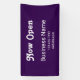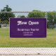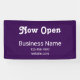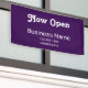This now open banner has a white text you can customize. This dark purple banner currently says Now Open. Additional lines of text are available for your business name, website and phone number.