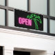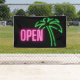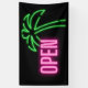 Texte rose néon "ouvert" avec silhouette de palmier tropical vert néon sur arrière - plan noir fait de ce texte un grand design pour personnel et une variété de magasins et d'entreprises