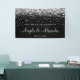 Art numérique de parties scintillant argenté contre le noir solide. Une calligraphie noire moderne et élégante, avec une police de style casquette moderne, affiche un message de bienvenue mariage. Customisez le style de police et les couleurs et créez votre propre bannière.