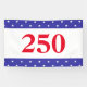 In celebration of the USA's 250th anniversary, 250 appear in red letters. Can be customized with desired text. A blue background with white stars is above and below a white stripe.