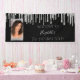 Une bannière pour une fête d'anniversaire de 21ème anniversaire, jeune fille et glamour (ou tout âge). Un arrière - plan noir chic avec des gouttes de parties scintillant en faux argent tendance, la peinture goutte à goutte. Personnalisez et ajoutez votre propre photo verticale de la fille d'anniversaire. Avec le texte : Bienvenue à. Ajoutez un nom et un âge ou un texte. Le nom est écrit dans un script de style moderne écrit à la main. Lettres blanches.