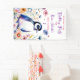 Un mignon pingouin entouré de fleurs rose, bleue, orange et violet aquarelle illustration fête d'anniversaire de la fille Welcome Banner.