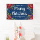 Cette bannière de fête de Noël Joyeux présente des fleurs de poinsettia aquarelle et du feuillage sur un arrière - plan bleu marine. Personnalisez-le avec un nom et une année.