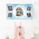 Bleu Otter thème de la fête du premier anniversaire du garçon personnalisé nom, âge et bannière photo avec loutre et nom. loutre de dessin animé tenant un gâteau d'anniversaire.