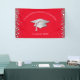 This modern design features a graduation hat and confetti in silver on a background of red with white text.
