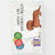 Design à thème d'anniversaire mignon avec l'illustration originale de Destei d'une robe rouge cheveux longs chien de race Dachshund. A côté du chien il y a des ballons colorés d'anniversaire attachés sur un os de chien et une boîte cadeau de couleur violet et jaune. L'arrière - plan a un motif ludique de confettis pastel colorés sur un arrière - plan blanc. Vous trouverez également une zone de texte personnalisable.