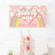 SUPER ! Bannière de 1er anniversaire d'inspiration rétro avec polices et couleurs de style 70, arc-en-ciel et marguerites en rose
