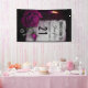 Une bannière d'anniversaire avec un look gothique. Un vieux papier parchemin gris avec des touches de rouge violet autour des bords. Un rose magenta en pleine floraison, un rosebud, une bougie et un casier argenté sur un arrière - plan bordeaux foncé crée un design gothique magnifique, sombre et mystérieux.