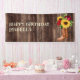 Banderole "Joyeux Anniversaire" sur mesure avec bottes rustiques de cowboy, tournesols jaune vif et belles roses rouges sur un arrière - plan en bois brun foncé. Personnalisez avec le nom de l'invité d'honneur.