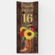 Banderole verticale de 16 ans sucrée avec de belles roses rouges et des tournesols jaunes à l'intérieur d'une botte rustique de cowboy. Personnalisée avec son nom et son âge.