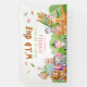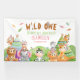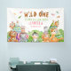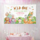 Cette banderole rassemble tout le charme d'un thème Wild One d'inspiration tribale avec de mignons bébés animaux de la forêt et de la savane. Vous apercevrez des ours, des renards, des éléphants, des zèbres, des lions et des girafes, tous vêtus de petits costumes tribaux adorables, entourés de tipis colorés, de plumes et de tons terreux. C'est un mélange amusant de créativité et de fantaisie qui allie les vibrations naturelles aux motifs tribaux.