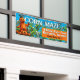 Gros panneau en tissu pour annoncer un labyrinthe de maïs. Une activité d'automne amusante pour la famille est de visiter une ferme locale et de suivre le labyrinthe à travers des tiges de maïs mortes. Cette enseigne de 2,5 x 6 pieds est d'une couleur bleue qui attire l'oeil. Un citrouille orange se dresse au milieu d'autres jack o'lanterns sur le côté gauche. Les tiges de maïs sont la toile de fond du texte blanc et noir gras. Indiquez le nom de la ferme et l'emplacement ainsi que les heures d'exploitation. D'autres dimensions de signes peuvent fonctionner. Il s'imprime comme vous le voyez, et ne laisse aucune formulation s'approcher du bord.