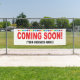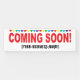 Bientôt avec des drapeaux colorés captivants et grand type rouge. Bannière des panneaux d'ouverture d'entreprise pour annoncer qu'une nouvelle entreprise sera bientôt ouverte dans un emplacement. Modifiez la ligne de nom à vos propres informations. Modifiez la couleur de l'arrière - plan si vous le souhaitez.