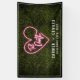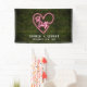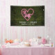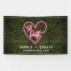 Le symbole de néon rose a inspiré le design de coeur "Til Death" sur le arrière - plan de boxwood inspiré par le texte blanc personnalisé pour les noms des mariés et des futurs mariés et la date mariage.