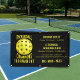 Customisez cette bannière amusante du tournoi de championnat de pickleball. Le design présente une illustration de boule de pickleball jaune avec des champions de pickleball jaune grunge qui courbent autour du ballon. Suivi par les détails du tournoi customisé : dates, emplacement et informations supplémentaires pour votre événement!