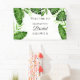 Thème tropical pour la fête de mariage avec des feuilles de palmier illustrées à l'aquarelle, des feuilles de monstera et autres plantes de jungle sur une pancarte de bienvenue personnalisée. Conçu et illustré avec amour par Kristine Lee Designs.
