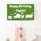 Cette bannière de fête d'anniversaire personnalisée est parfaite pour les fêtes à thème de la ferme ou pour lancer une fête pour toute personne qui aime les moutons. Ces fournitures de fête présentent des illustrations de moutons du Valais BlACTE en blanc et noir contre un arrière - plan vert vif. La bannière est prête à être personnalisée avec votre propre message en caractères blancs gras.