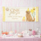 Célébrez le grand jalon de votre petite fille avec cette adorable bannière d’anniversaire "Une année d’or" qui présente un chiot de récupération d’or dans un casquette de fête, des cupcakes, des ballons et des accents en vichy jaunes. Parfait pour un premier anniversaire, cette bannière fait une déclaration douce et festive derrière la table des desserts ou à l'entrée de la fête. Personnalisez avec le nom de votre enfant pour un détail de fête plein de charme et prêt à photographier!
