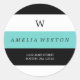 Étiquette d'adresse de retour monogramme en noir, blanc et turquoise avec de larges bandes et une police élégante.