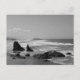 Craggy rocks surge up from the beach as the ocean waves lazily roll into shore. Contrasts of black and white mix with grey, leaving out distractions from the form and expanse the ocean view provides
