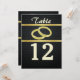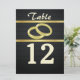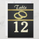 Black and gold elegance! The small circular, embossed pattern and two gold horizontal bands are the background for the featured wedding bands on these table number cards.