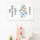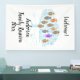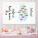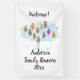 Branches of tree holds a family of owls. Each bird is different colouring. Above tree is the greeting "Welcome" and beneath are the event specifics. Personalize with your greeting, family and event name along with a date, as necessary.