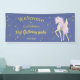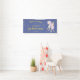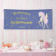 Bannière bienvenue au premier anniversaire avec l'image d'une licorne douce avec des ailes sur un ciel étoilé bleu.