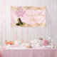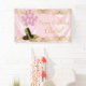 Bannière de fête d'anniversaire chaussure à talon haut rose et or avec de jolis ballons roses, des chaussures à talon haut et des perles sur un fond en spirale en satin rose. Cette belle bannière de fête d'anniversaire rose et or est facilement personnalisable avec le texte de votre choix. Il s'agit d'une conception imprimée sans satin réel, paillettes, perles, etc.