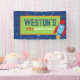 Bannière d'anniversaire en vinyle de fusée rouge et bleue dans l'espace extra-atmosphérique.
